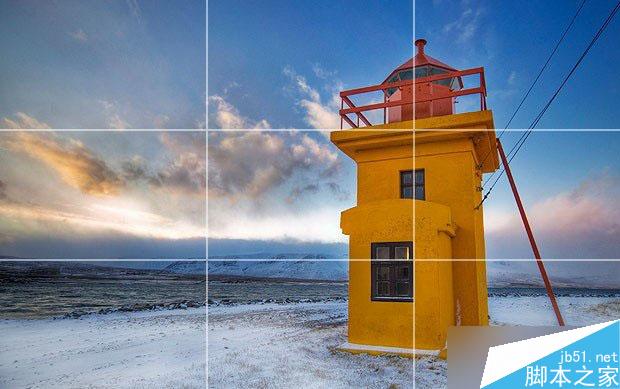 三分法理論,借助兩橫兩豎將圖片分割成為9個部分,交叉處為圖片的重要部位,或者設計重心。