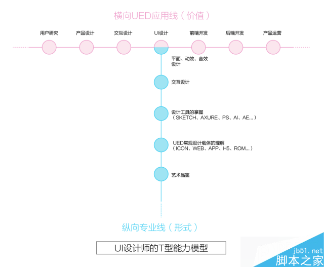 最后我們同理繪制出了UI設(shè)計(jì)師的T型能力模型,你也可以根據(jù)自己的實(shí)際專業(yè)和應(yīng)用行業(yè)情況來(lái)繪制自己的能力模型。
