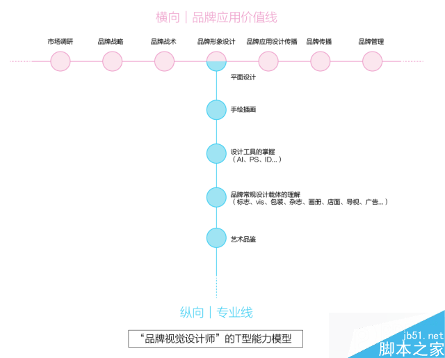 此模型由"縱向的專業(yè)線"和"橫向的應(yīng)用價(jià)值線",意在讓專業(yè)能力和應(yīng)用鏈條結(jié)合,從而實(shí)現(xiàn)設(shè)計(jì)價(jià)值。接下來(lái)我們以上圖"品牌視覺設(shè)計(jì)師的T型能力模型"為例,詳細(xì)介紹一下縱橫兩條線。