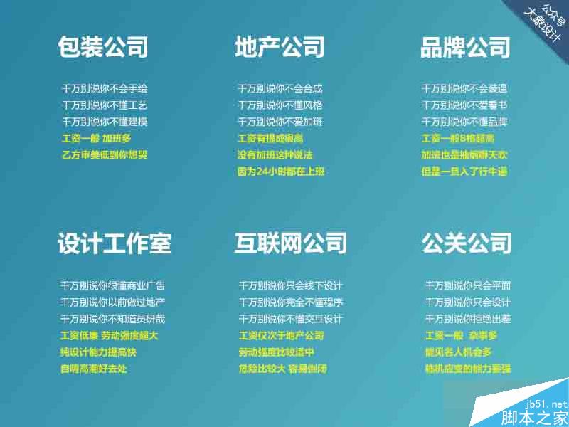 目前來說,還是互聯網公司和地產公司對于應屆生來說比較友好,成長空間也比較大,品牌公司對于英語的要求很高,B格太高,一般沒人推薦進不去,公關公司和包裝公司會有出差,還會幫忙做一些線下活動的執行工作,而設計工作室大多是設計師自己出來開的,不穩當,各位童鞋知道自己適合什么了嗎?