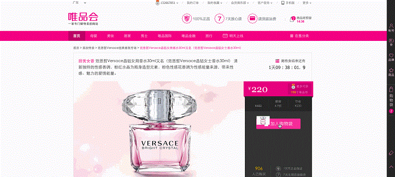 如下圖:唯品會商品加入購物車時的動效,讓用戶關注側邊欄的購物車