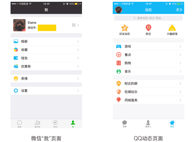 如下圖,微信"我"頁面、QQ動態頁面利用分組和間隔來創造規律,也讓用戶更方便查找和觸達。