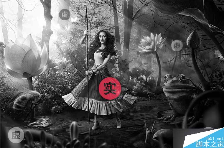 上左圖中按箭頭所示方向依次由實到虛變化,滿足正常情況下近實遠虛的道理,層次感很強;在上右圖中,實景和遠處的虛景想必大家都可以理解,但為什么離我們最近的下方的人也是虛的呢?我們看下下面這張圖可能更容易理解。