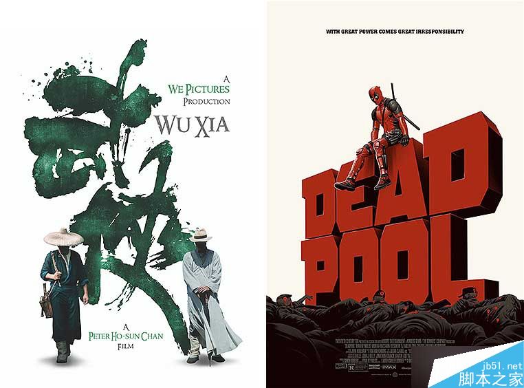 上左圖將書法的"武俠"二字作為畫面主視覺進行處理,而右圖則直接將死侍坐在類似3d處理后的電影名字上,很好的融入到了畫面中。運用到網頁設計當中如下:
