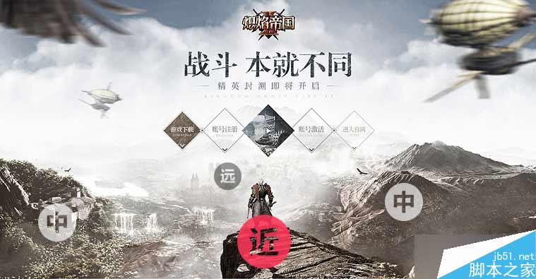 上兩圖中按箭頭所示方向由近及遠,畫面縱深感強,遠近景層次明顯,畫面感很強。運用到網頁設計當中如下: