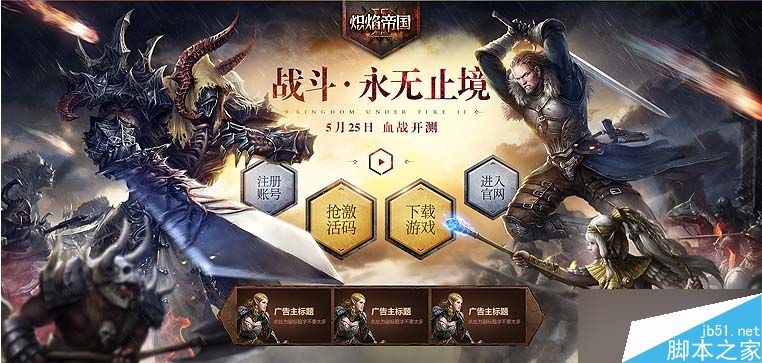 這里通過對原畫的再次處理,加強了畫面的對比度,進一步加強了冷暖對比,對距離遠近不同的人物也通過模糊、調色、添加煙霧及火光等素材進行了層次上的進一步區分,同時添加了下雨及火炮等氛圍元素。頁面的部分內容元素相對于人物做了一個前后的處理,使得頁面整體的層次得到了進一步的加強。