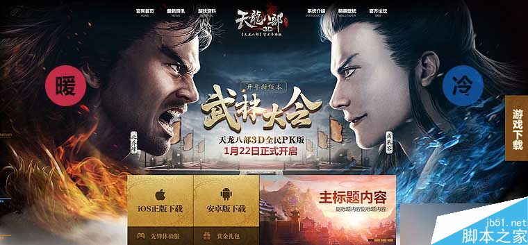 上三圖中,在色調處理上都運用了冷暖對比的形式,使畫面的細節更加豐富,同時,冷暖的對比可以表達出超強的對抗性。運用到網頁設計當中如下: