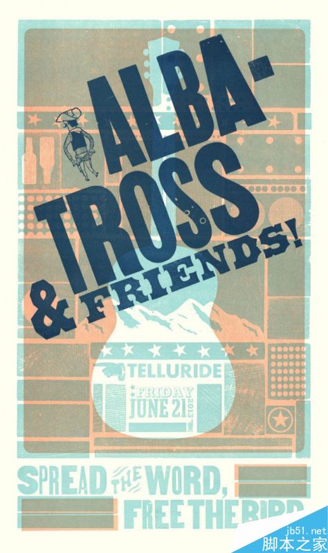 在下面的設計中, Brad Vetter為了演出而設計的凸版印刷海報中背景顯示了兩種類似光照的柔和色調。與之相對比,深海軍藍被用來強調標題——出演的藝術家。