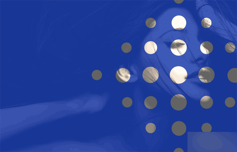 在圖片的上方增加一個純色的深藍色圖層,圖層的靠右側,也是攝影作品的右邊人物面部焦點處利用蒙板制作出步驟一的圖案,略降低這個圖層的透明度。