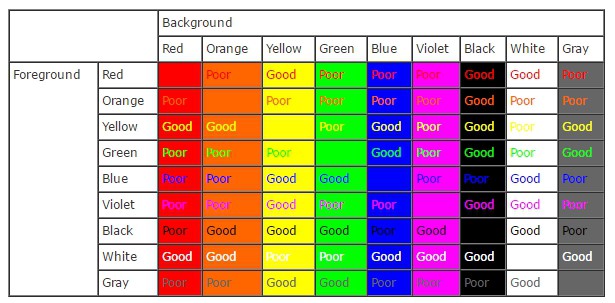 對比度方面Webdesign.about.com 所給出的這個對比度的表單很好的為我們展現(xiàn)了不同色彩在對比度上的實際效果。這個表格最有意思的地方在于,黑色這一欄證明了黑色幾乎是唯一一個能和其他色彩都構(gòu)成不錯對比度的色彩。在進行界面設(shè)計的時候,盡量仔細測試每種色彩,而黑色的這種特性使得深色背景下的色彩搭配擁有更多的可能性。