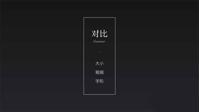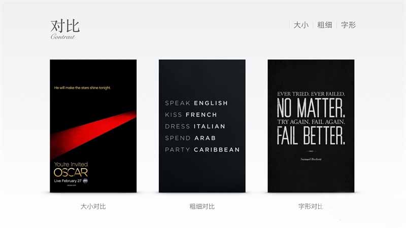 字形對比:相對以上兩種更加自由多樣,最普通的為襯線體與非襯線體的對比,甚至還可以進行字體設計,加入圖形元素等。