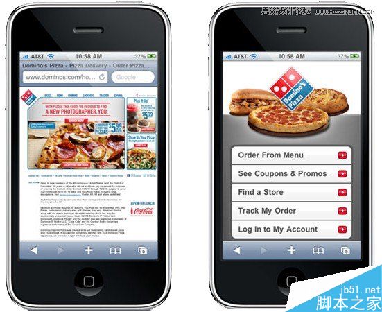 桌面端網(wǎng)頁(yè)在移動(dòng)端設(shè)備上首要的障礙就是導(dǎo)航的使用。看看下面Domino批薩的案例,它的桌面端和移動(dòng)端網(wǎng)頁(yè)的對(duì)比就相當(dāng)明顯,移動(dòng)端頁(yè)面經(jīng)過優(yōu)化之后的體驗(yàn)就完全不同。簡(jiǎn)單說來,優(yōu)化后的移動(dòng)端頁(yè)面更加干凈,有著更容易導(dǎo)航的CTA按鈕