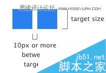 另外一個(gè)需要考慮的是就是可觸摸控件指尖的距離。如果兩個(gè)按鈕比較靠近,那么用戶在移動(dòng)端上就很容易出現(xiàn)誤觸的情況了。如果想要解決這個(gè)問題,就需要根據(jù)實(shí)際情況重新調(diào)整尺寸和按鈕之間的距離,以適應(yīng)用戶手指交互的需求。下面是推薦的尺寸設(shè)定。