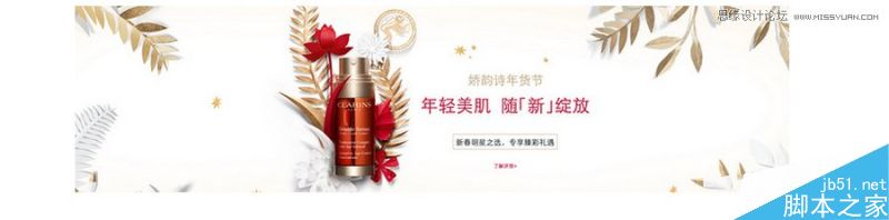 這張banner的主體是物體 ,在主體的周圍添加了花和葉子豐富主體。在畫面四周也添加了些相同元素,這樣畫面更加統一、和諧。文字部分采用黑體居中對齊排列。畫面整體給你感覺典雅、舒適。