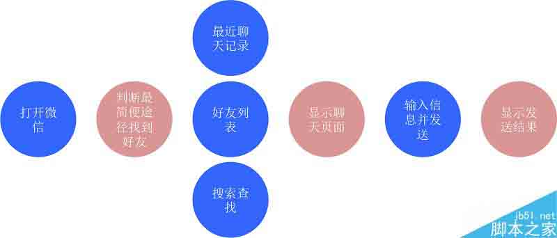 完成任務與場景的梳理以后,就要進第二步,就是要針對一個任務的一個主要場景梳理出用戶與產品存在的交互點(InteractionPoint),也就是用戶在完成任務過程中,與產品之間存在的物理與心理的互動關系。我們以通過微信找到好友并發送消息為例,來說明該任務中存在的用戶與產品之間存在的交互點。在這個過程中,通過對交互點的整理,可以清楚的看到完成某項任務的難易程度,以及對于用戶可能存在的交互障礙,需要在具體的界面設計時,對用進行引導,來避免用戶出現困惑或者錯誤。