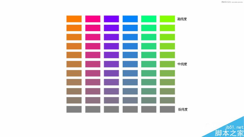 2、純度(等于飽和度):是指原色在色彩中所占據的百分比。很多人都以為色相就是在原色的基礎上加黑色,其實不止這樣,紅色加上綠的(別的色都可以),也會降低紅色的純度。