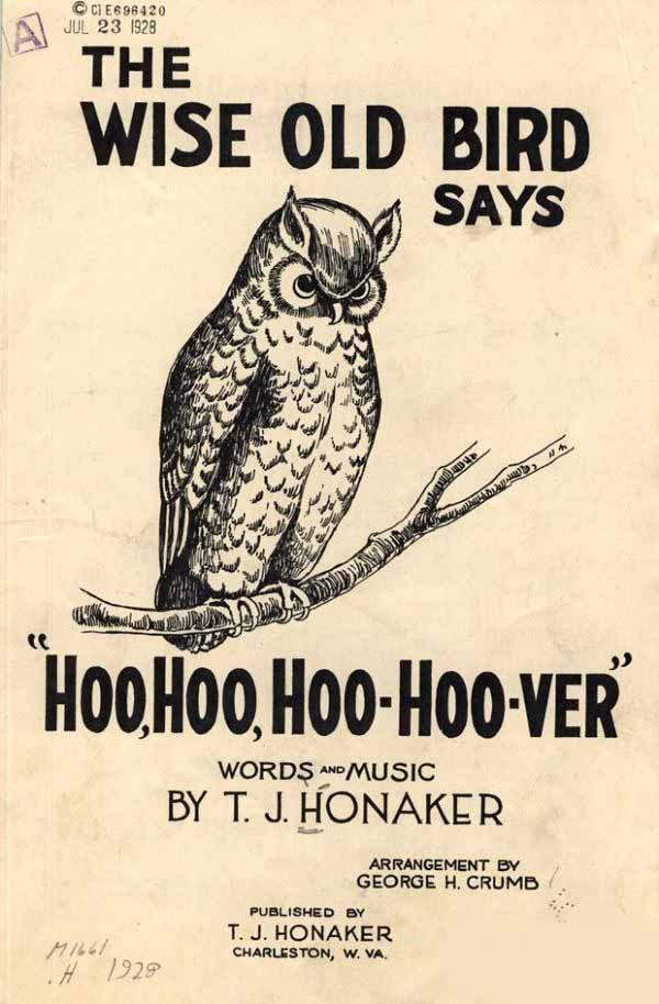 1928年,胡佛競(jìng)選成為新一屆的美國(guó)總統(tǒng)。在這張競(jìng)選海報(bào)中,貓頭鷹代表著睿智的形象,搭配的宣傳文字是:這只智慧的老鳥(niǎo)說(shuō):胡,胡,胡,胡-胡-佛,即點(diǎn)綴了胡佛的名字,也與鳥(niǎo)的叫聲相映成趣。