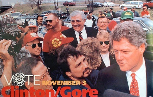 1992年,希拉里的丈夫比爾克林頓競(jìng)選美國(guó)總統(tǒng)。這是一張極度親民且寫(xiě)實(shí)的"真人海報(bào)",與其他總統(tǒng)候選人海報(bào)所展現(xiàn)的那種"高高在上"感不同,克林頓在這張海報(bào)里被眾人簇?fù)碇扔?quot;中心感",也與選民非常"親近"。