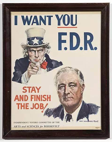 依舊是羅斯福,依舊是1944年。這一年,羅斯福已經(jīng)病重,但是二戰(zhàn)的局勢(shì)令他難以離任。這張海報(bào)是其支持者繪制的,非官方出品。在海報(bào)中,代表著美國(guó)形象的山姆大叔指著羅斯福說(shuō):"我要你留下來(lái),完成這份工作。"