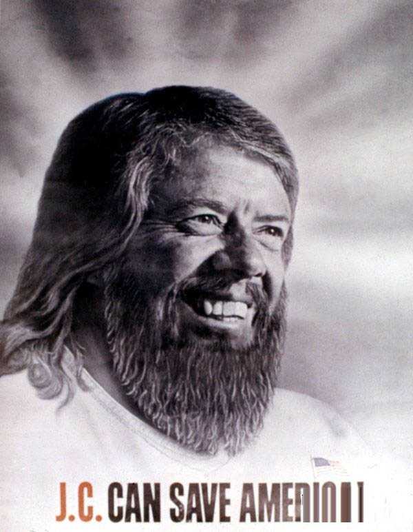 耶穌降臨!這是吉米卡特在1976年競(jìng)選美國(guó)總統(tǒng)時(shí)的競(jìng)選海報(bào)。當(dāng)時(shí),因?yàn)槟峥怂傻乃T(mén)事件,美國(guó)民眾對(duì)白宮的信任極大降低。吉米卡特順勢(shì)而為,塑造了自己的耶穌形象,并且配上口號(hào)"J.C Can Save America"(吉米卡特可以拯救美國(guó)),用道德標(biāo)榜贏得了大選。