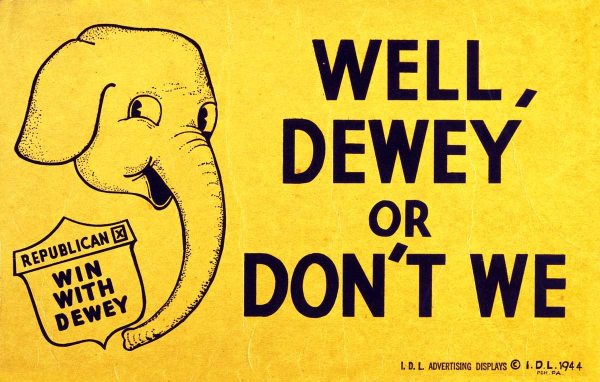 你沒(méi)有看錯(cuò),這也是一張競(jìng)選海報(bào)。1944年,杜威競(jìng)選總統(tǒng),他當(dāng)時(shí)的競(jìng)爭(zhēng)對(duì)手是富蘭克林羅斯福。杜威在這張海報(bào)中的口號(hào)是一句雙關(guān),諧音:Do we, or don't we。口號(hào)十分吸引人,可惜還是敗給了聲望卓越的羅斯福。