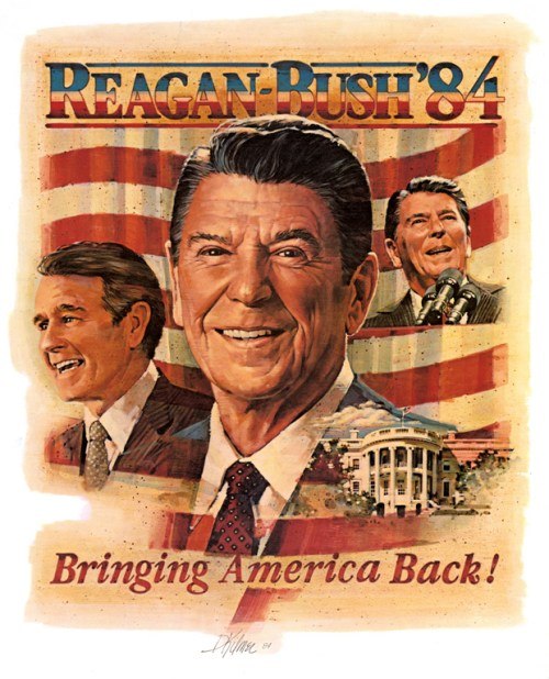 還是1984年,只不過(guò)海報(bào)主人公是當(dāng)時(shí)笑到最后的里根。里根在進(jìn)入白宮前是著名演員,萬(wàn)人迷,極善演講,80年代的"奧巴馬"。他喊出的口號(hào)是"Bring America Back",力壓了上圖主人公蒙代爾的"自由引導(dǎo)人民"。