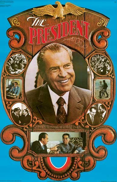 尼克松的競(jìng)選海報(bào)以花哨鮮艷著稱(chēng)。在1972年的連任競(jìng)選中,他的團(tuán)隊(duì)將尼克松在第一個(gè)任期內(nèi)的諸多成就堆砌在了海報(bào)中,如競(jìng)選演講,在南方廢除種族隔離等。其中最有名的,要屬正下方的照片:尼克松與周恩來(lái)總理會(huì)面,拉開(kāi)中美建交的大門(mén)。