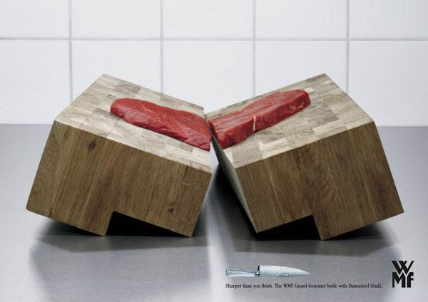 從上個分析中我們得到創意就是給人意想不到的效果,給人驚喜,而在廣告的運用中,創意更是最核心的部分,如Scotch運用非常簡單的畫面,貼上膠帶,就算把堅硬的圖釘掰彎了都撕不下了,來比喻他們的產品質量超群,而wmf也是運用的相同的手法,一把小刀太過鋒利導致把整張桌子都切成兩半,也是用非常夸張的手法來強調他們產品的功能性,打破了固有的思維方式,給了消費者意想不到的結果,所以創意應該是,情理之中卻是意料之外的。