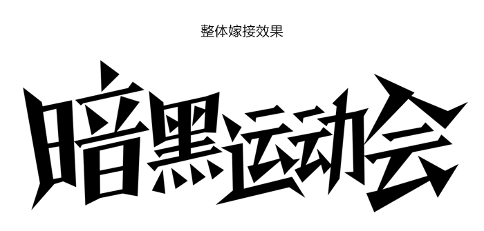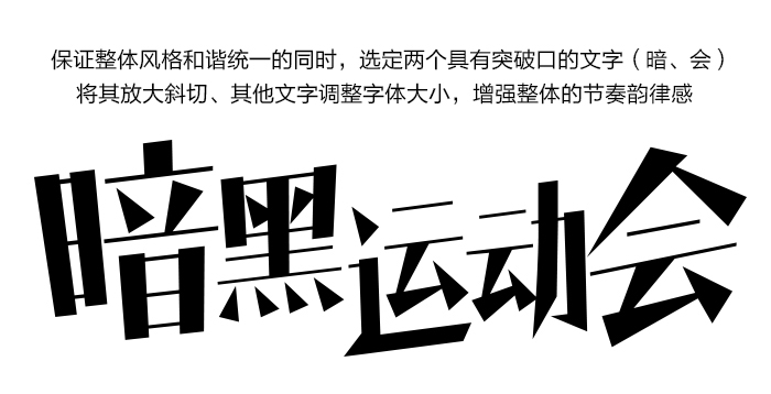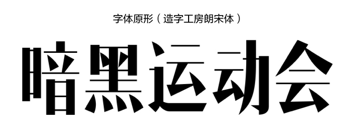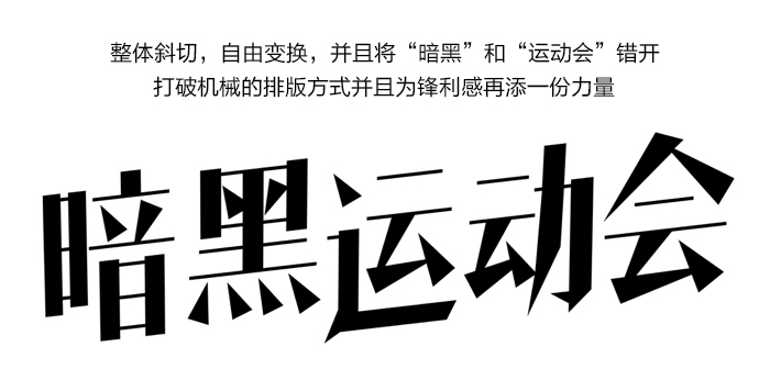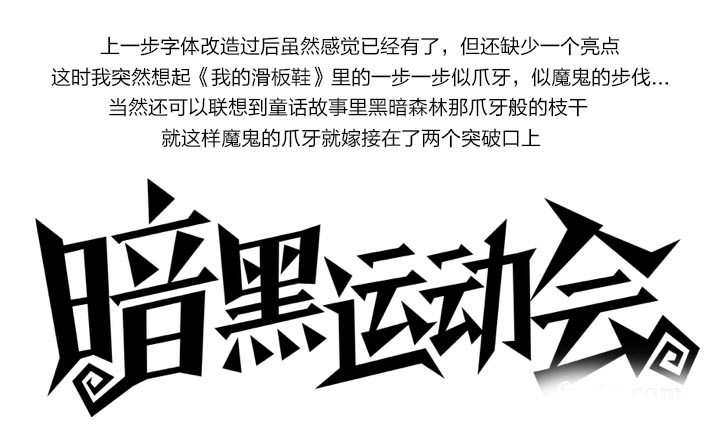 接下來我把日常工作中做過的案例給大家分析一下,第一個小案例是團隊趣味運動會暗黑篇的一個字體設計,字體的原形是造字工房的朗宋體,這家的字體是禁止商用的因此必須經過變形后才能使用,最好變的連它親爹也不認識了,哈哈,并且字體看起來非常平淡,又跟暗黑風格相差甚遠,這就促使了我們進行字體改造的欲望,嘿嘿…嫁接之前還有一段變形的過程哦!