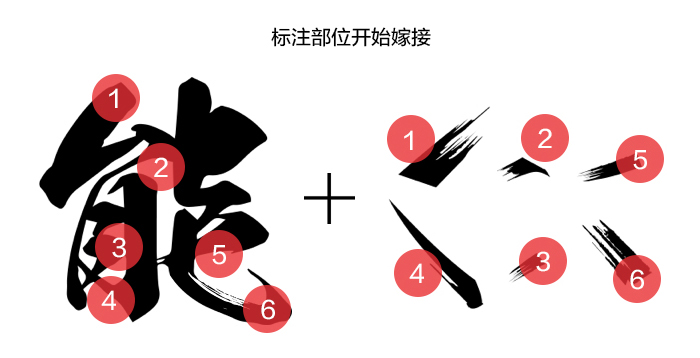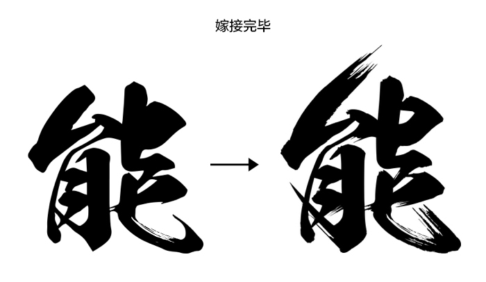 字體嫁接首先要了解它的結構和組合形式,也就是筆劃的來龍去脈,嫁接的主要部位一般在文字筆劃的開始和結尾處,這樣字體會比較符合章法上的邏輯,并且也會使其顯得更有張力,還有中間區域也可稍加修飾,這個由字形而定。 拿書法字體"能"字舉個例子,舉例之前再發個牢騷,很多同學問我為啥手寫書法和專題海報中的書法不同,其實我們常用的類似書法風韻的字體并非現實中真正意義上的書法,真正意義上的書法是有章可循的,我們用的字體是經過改造的,只是感覺像而已,目的是為了使其更加有張力和感染力。我去,又說了這么多,請看例子吧。相信這個示意圖大家一看便懂。
