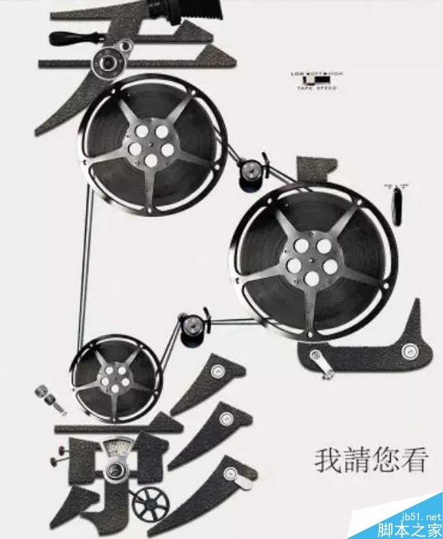 可讀性:注意結構和形態(tài)的識別度。美術字首先得能被識別出來,我們在融入藝術創(chuàng)作的同時要保證受眾能夠準確的理解字體含義。如下圖,"看電影"三個字中都有部分筆畫被其他物件代替,但是文字的結構并沒有得到破壞,用于取代的物件也是跟主題相關的東西,讓人能迅速識別并產生好奇。