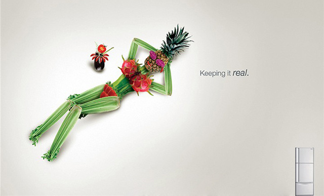 很多剛畢業的年輕人還是很有想法的,但大多是一些天馬行空的創意,不適合商業使用或者很難執行出來。因為我們在大學里學得是如何把思維打開,而不是解決具體的商業問題。記得我剛去到一些大公司的時候,每次頭腦風暴都會說出一大堆的創意,找一堆的參考,但總監總說我想的是飛機稿,客戶不會要;而資深設計師或美指們一般只提兩個左右的想法,結果更能獲得青睞,這種情況過了好長一段時間才得到改觀。同樣是冰箱廣告,客戶想要的創意是這樣的: