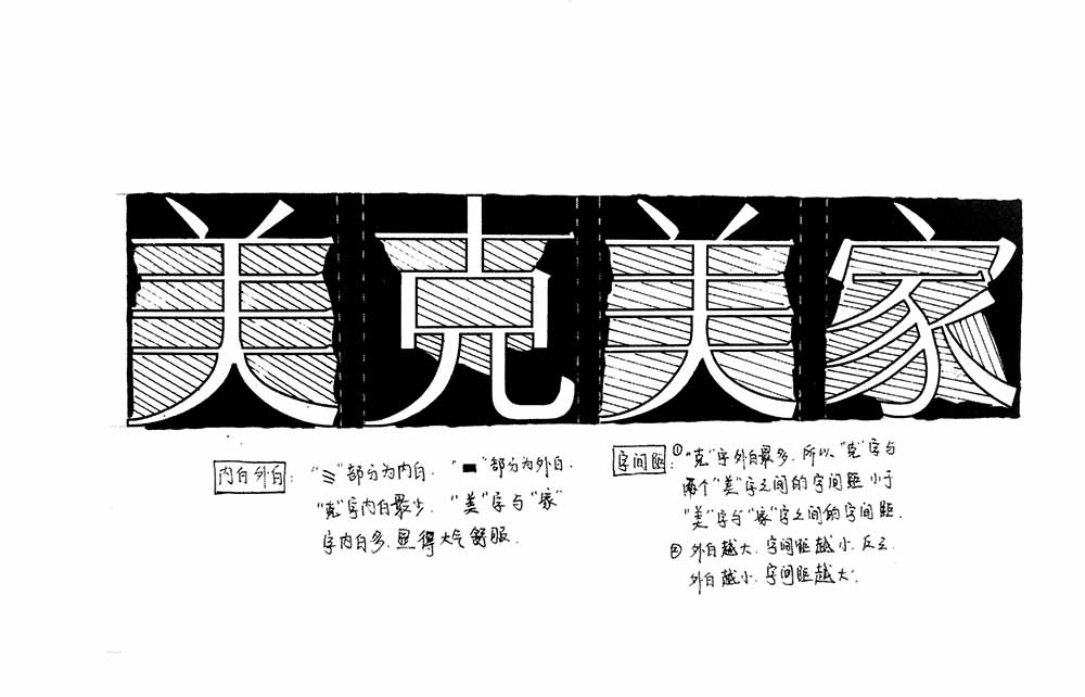 -布白均勻決定著一個(gè)字的品相和氣質(zhì),中國(guó)書法講究計(jì)白當(dāng)黑。外白與內(nèi)白在的大小影響著字與字之間的距離,克字外白最大,所以它與相鄰的美字之間的距離要小于美字與家字之間的距離。尤其在西文字體中,字母之間的距離不是均等的就是這個(gè)道理。