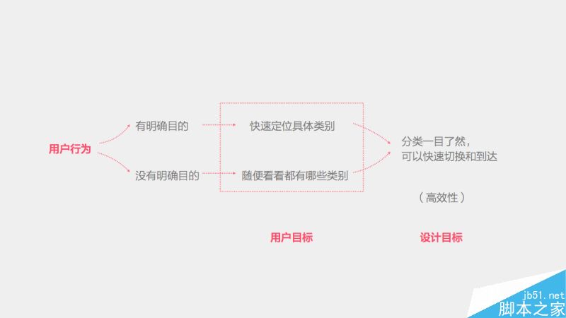 我們通過組織用戶訪談,得出了一個用戶行為模型。用戶在使用分類瀏覽頁面時,主要分為兩類行為——一種是有明確目的的,比如就想來看明星李易峰的圖片,就想來找找手機桌面壁紙。還有一種是沒有明確目的的,我只是隨便看看,都有哪些類別,有喜歡的感興趣的,就點進去看看。