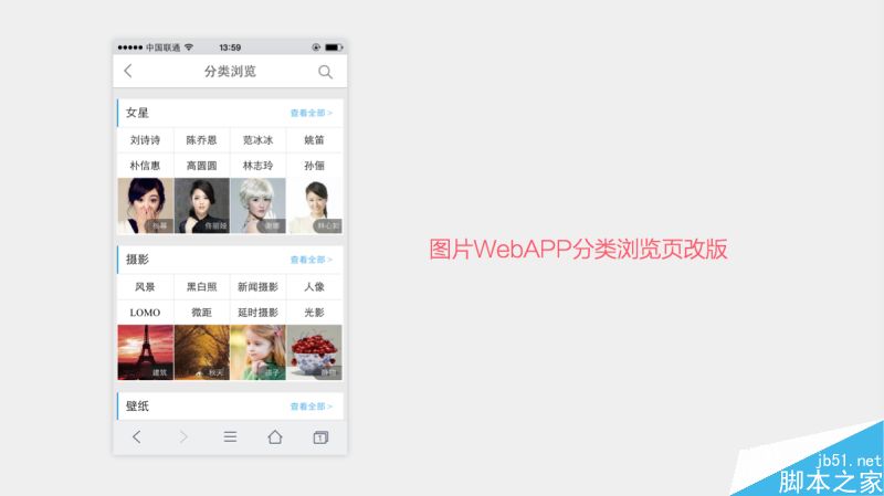 這是百度圖片手機WAP站的分類瀏覽頁,現在產品經理提出要進行優化改版。同樣的道理,不要急于上手去畫圖,首先要通過調研分析確定改版目標。