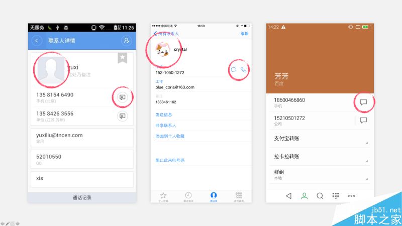 大家來看這三個界面,從左往右依次是——我們要進行優化的現有產品的聯系人詳情頁、iOS系統的聯系人詳情頁、魅族手機聯系人詳情頁。需求是,對第一個頁面進行優化設計。仔細看看這三個界面,大家會不會覺得都是大同小異啊,都是這里有個頭像,魅族這里稍微不太一樣,是橙色的這一大塊,不過感覺也很一般啊。下面的內容基本都是一行一行的電話號碼,后面帶著短信或是其他圖標。那么,怎么去做優化呢?