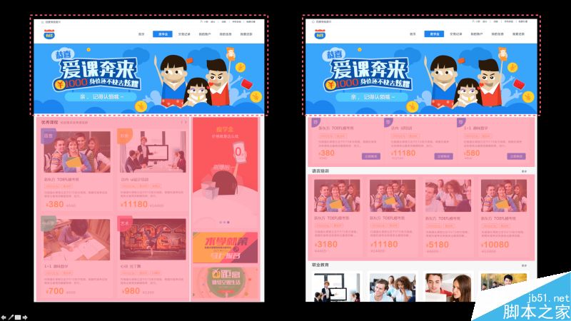 那么請大家來看一下,這里的兩個方案。先來簡單介紹一下背景,這是百度金融產品線面向教育貸款的一個產品,用戶可以通過這個網站找到想要學習的課程,并進行在線貸款申請。我們可以看到,這兩個方案的頭部是完全一樣的,區別在于下方的課程內容區,一個是左右兩部分,左邊是幾大類課程的入口,右邊是廣告位。另一個方案是通欄,上面是熱門課程推薦、下面是展示具體類目下的熱門課程。 有的同學會說了,這也沒有太大區別嘛!沒錯!這時,我們再用以往的經驗來評判方案的好壞,就會發現很難做出判斷。