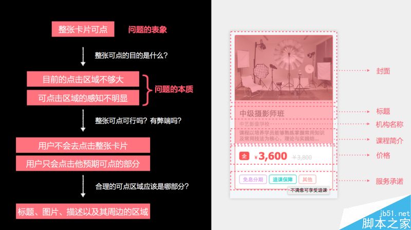 這是我們產品中經常能夠見到的卡片設計。現在給大家看到這個卡片是一個課程卡片,它主要分為:封面、標題……。鼠標移上去時,會有一個紅框。設計師在設計時設定的點擊區域為:點擊封面或者是標題,就可以跳轉到課程的介紹頁。但是,在產品即將上線時,這個項目的經理提出了一個質疑:可點擊區域為什么不是整張卡片?