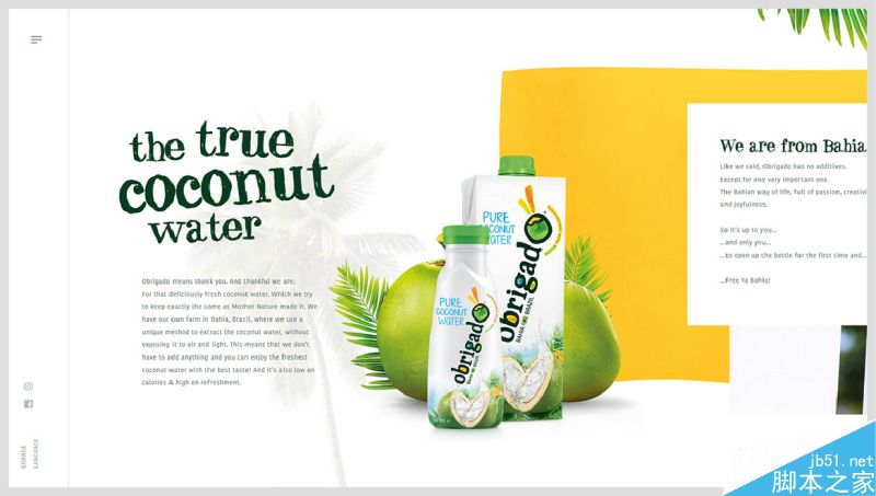 Obrigado椰子水飲料網站的主色調就是用了綠色與白色相結合,穿插了一些橘黃色,起到活躍畫面的作用,綠色是標志的主色,橘黃色也是標志的一個輔助色,可以看到整個網站簡潔清爽,黃色和綠色并不是等比重出現在網頁當中,就跟標志一樣,黃色的占比少??梢栽L問看看,里面一些交互運用也做得比較好。