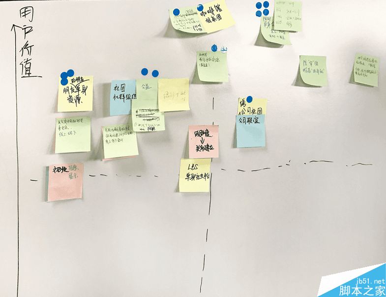 我們團隊采用了前兩者。在板上畫出一個坐標,橫坐標為“成本”,縱坐標為“用戶價值”,每個人將自己的idea貼到相應的位置,然后大家每人兩票進行投票。