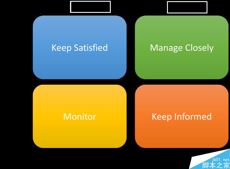 針對這個問題之后,我們進行了利益相關者分析。在紙上畫一個坐標軸,橫軸為“興趣”,縱軸為“權利”,然后把能夠想到的利益相關者寫在便簽上,貼到對應的坐標系里面。如下這張圖表示我們對利益相關者要怎么處理:權利高興趣低的比如政府,我們要“讓他滿意”,權利低興趣高的我們要“保持通知”,“權利低興趣低”的進行監測,看看什么時候突然變高了,而“權利高興趣高”我們要重點關注。