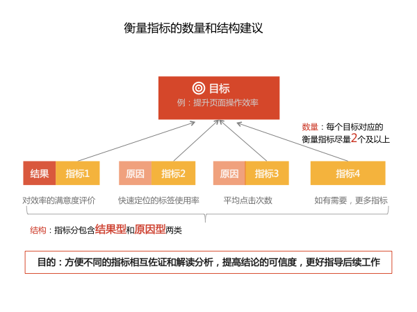 指標的制定除了是衡量目標是否達成外,還有個重要的作用在于幫助解讀分析改版結果,從而為目標達成提供佐證和為后續的工作提供指導,因此,對于指標的的數量和結構的建議是