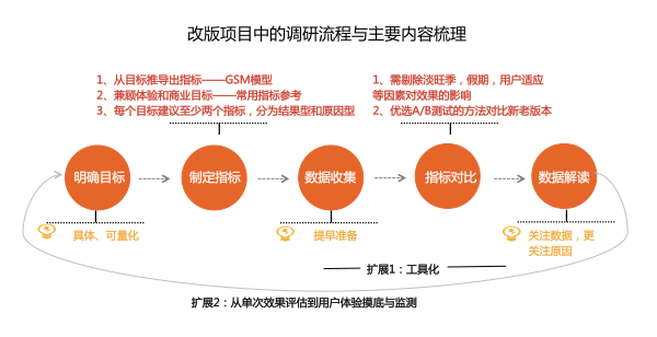 綜上,改版效果評估的調研工作可以歸納為:三個意識,五個環節,兩個擴展。