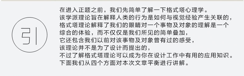 在進入正題之前,我們先簡單了解一下格式塔心理學。該學派理論只在解釋人類的行為是如何與視覺經驗產生關聯的。格式塔理論解釋了我們的眼睛對一個實物及其對象的理解是一個綜合的體驗,而不僅僅是我們所見的簡單疊加,他包含我們以前對該實物及對象曾有過的感受。格式塔并不是為了設計而提出的,不過了解格式塔理論可以成為你再設計工作中有用的運用知識。下面我們從四個方面對本次文章平衡進行講解。