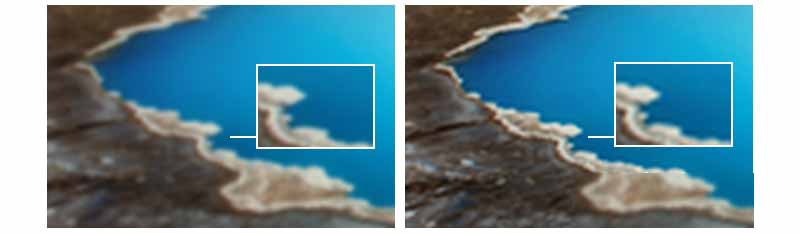 比起直接過渡,柔和過渡對圖片的表達會更飽滿,細節會更多,這也是為什么我們要用盡可能大分辨率圖片的原因,我們通常所說的圖片分辨率其實就是指某一特定尺寸內所包含的像素數量的多少,拿顯示器常用的分辨率1920X1080來說,1920指的是橫向尺寸內的像素數量,1080是指豎向尺寸內的像素數量,那么整個顯示器所顯示的像素數量就是1920X1080個,所以當我們把顯示器分辨率調到1280X720,桌面的圖標和文字會變大,但是精度會變差,就是同等單位里的像素數量變少了,過度生硬了,所以圖片應用中,我們也要盡可能去找同一單位像素數量內分辨率更大的圖片。