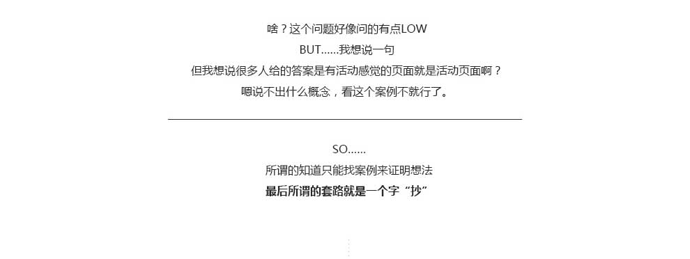 每一個設計的成長都要分階段吃情深。接下來我要講的內容是根據設計者的不同階段來講解活動頁面的設計思路自然是設計思路,那么接下來我們要開始思考問題,01:什么樣的域名算得上是活動頁面 啥?這個問題問的好像有點LOW,BUT。。。。。我想說一句,但我想說很多人給的答案是——有活動感覺的頁面就是活動頁面??!嗯,說不出什么概念,看這個案例不就行了。