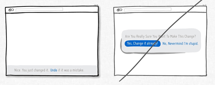 假設(shè)你剛點(diǎn)擊了一個鏈接或者按鈕,撤銷操作可以讓操作流暢自然,也更符合人類的本能。而每次操作都彈一個確定框則好像是在質(zhì)問用戶你明白不明白這個操作會產(chǎn)生什么后果。其實(shí)只有極少數(shù)情況下才會發(fā)生誤操作。所以,為了防止誤操作而設(shè)計的確認(rèn)窗口其實(shí)是不人性化的,用戶每次操作都需要進(jìn)行毫無意義的確定。所以請考慮在你的產(chǎn)品里實(shí)現(xiàn)撤銷操作來提升用戶的操作友好度吧。