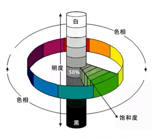 其實可以簡單的理解為一個以色相環為基礎變化成的一個圓柱體,圓柱體的側面分布了整個色相環;圓柱體的底面到頂面,色相環的亮度發生變化;圓柱體的軸心到側扁表層,純度發生變化。
