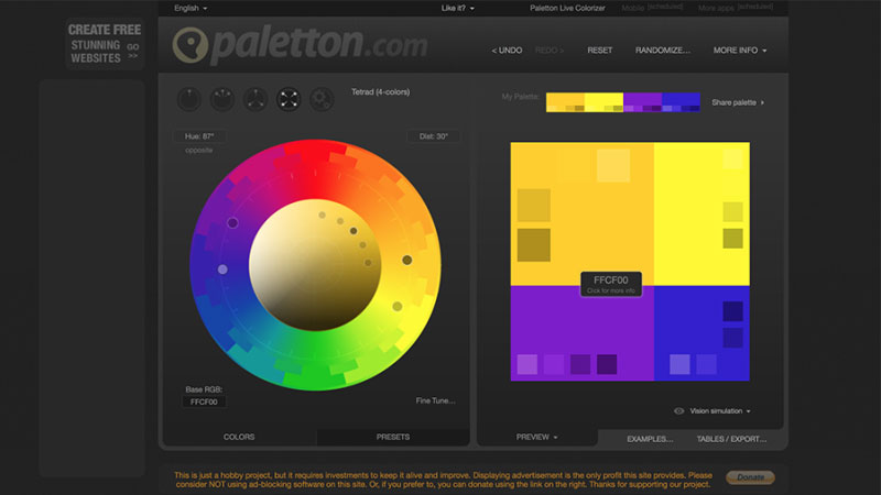 我經常使用這個網站用于,我只確定了一個主色的情況下,它能幫助我擴展這個色彩,搭配出數種方案,甚至還有色盲修正方案。如果你只能確定一個必須使用的顏色,選擇這個工具或許能獲得一些靈感。