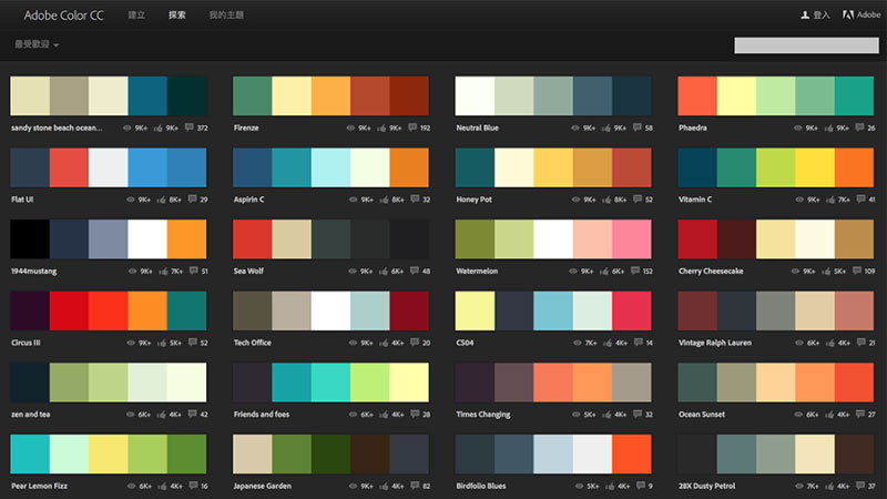 它的原名更為著名,也就是Kuler ,不知道什么時候開始改了名字,不過功能沒有發生太大的變化。這是一個由設計師分享配色方案的一個平臺,已經保存了成千上萬的預制配色方案。在photoshop上自帶了一個插件,你可以直接調用上面的色彩方案,并且非常方便的應用到你的設計稿中去。